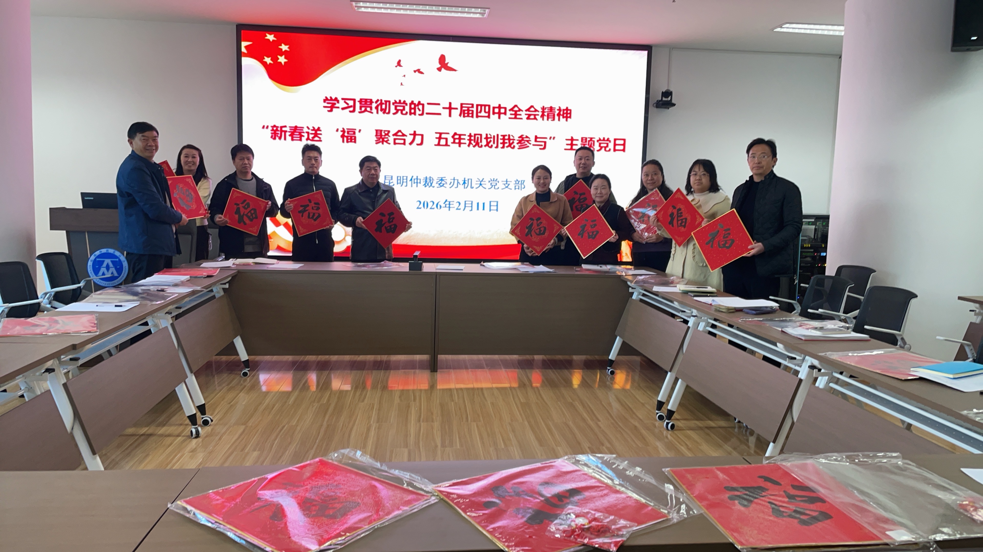 2026年2月11日下午,昆明仲裁委办公室机关党支部开展了一次别开生面的主题党日活动,在深入学习党的二十届四中全会精神基础上,机关党支部组织喜欢书法的党员书写“福”字,为全体党员送上新春祝“福”。